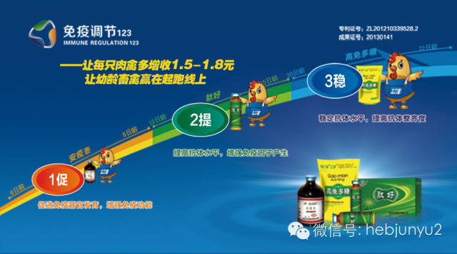 免疫调节“123”方案可增强免疫功能,提高抗体水平,使家禽不发病或少发病,即便发病也可做到可防可控。截止目前,经百余个规模养殖场上千万只家禽使用验证,能够显著提高机体免疫力、抗病力,有效降低发病率,缩短治疗时间。