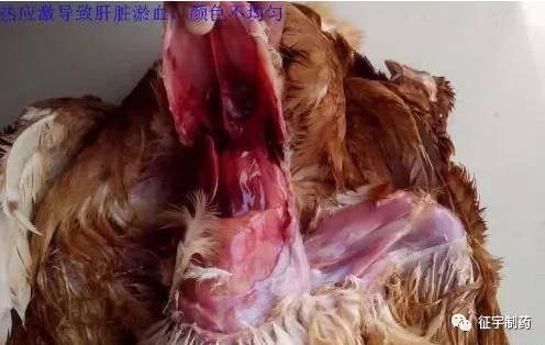 体况良好,嗉囊有饲料。胸部皮肤呈紫红色,扯开皮肤,因机体散热能力下降,体热蓄积,导致肌肉发白,似半煮熟状。肺脏多淤血水肿,心外膜出血,卵泡充血,肝脏多淤血肿大,肥胖者肝多呈土黄色,肝包膜下常有出血点或出血泡,肠壁很薄,内有气体或豆渣样物。