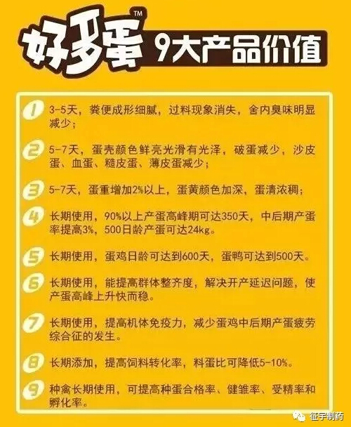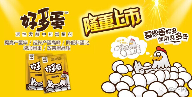 做好蛋鸡保健,会大大降低疾病发生率,提高产蛋率。征宇制药运用现代生物工程技术结合中兽医理论研发的活性发酵中药增蛋剂——好多蛋,全面调理蛋禽亚健康,强壮体质,防止因气血不足造成机体虚弱;提高机体免疫力,阻止外邪入侵引起的卵巢坏死、输卵管炎和产蛋下降;全面改善肠道环境,提高饲料利用率,减少腹泻、过料等;促进生殖器官发育、增加卵泡数,激活蛋禽卵巢功能,提高产蛋率、受精率,延长产蛋高峰。让蛋鸡多产蛋、产好蛋、产蛋时间长。