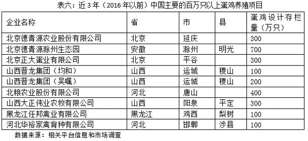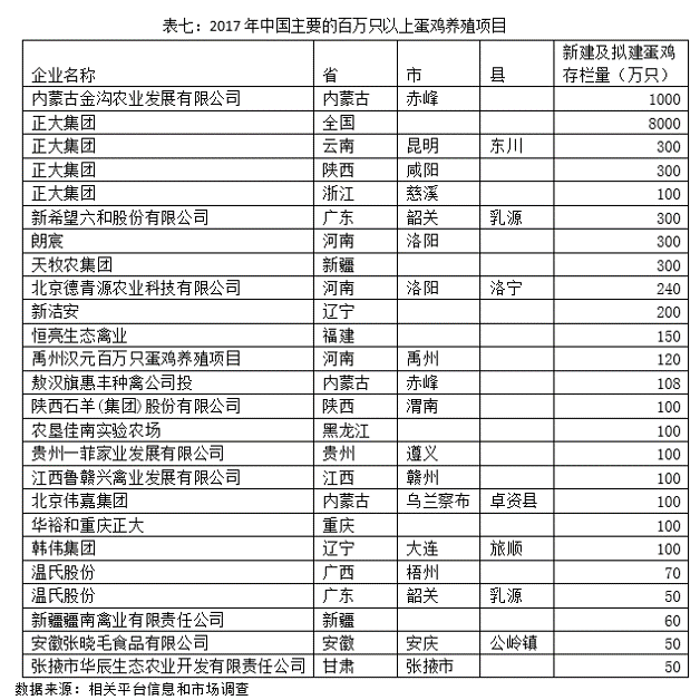同时,近3年中国新建及拟建百万级规模蛋鸡企业也在全国布局,100万只以上的场近20家以上,仅规划中的商品蛋鸡存栏数将超过1.2亿只(规划或正在建设中),若投产将对未来鸡蛋产能造成巨大的压力。(详情请参考表六、七)