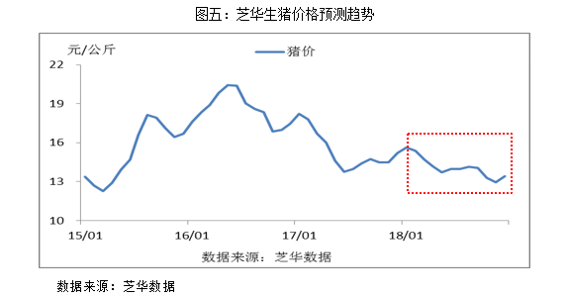以农业部存栏为基础数据,我们判断2018年生猪存栏将会小幅增加,到年底能繁母猪存栏恢复至3500万头,同比增长1.2%,生猪存栏3.52亿头,同比增长0.21%。猪价将延续下跌趋势不变,全年均价14元/公斤,较今年跌幅8.2%。猪价延续下跌趋势,对鸡蛋需求提振有限。(详情请参考图五)