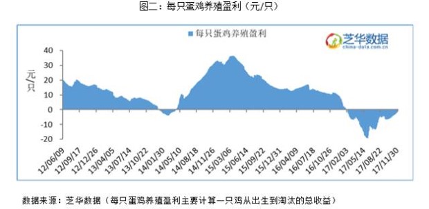 从蛋鸡养殖盈利周期来看,2017年上半年蛋鸡养殖盈利持续亏损,导致老鸡大量淘汰,补栏意愿大幅减弱,据此推断未来一年左右蛋鸡养殖为盈利期增长期。(这里指的蛋鸡养殖盈利指的是每只蛋鸡养殖盈利)