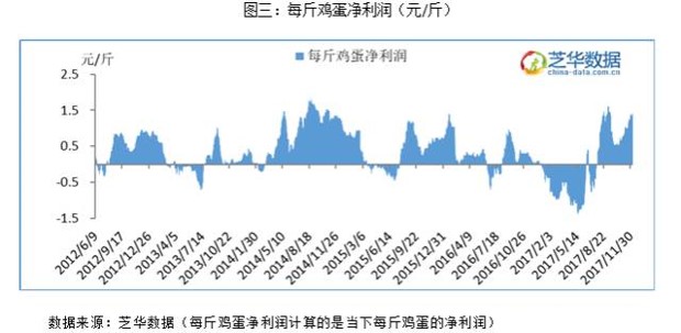 从每斤鸡蛋净利润来看,2017年亏损持续时间长且幅度大。进入2017年鸡蛋跌破成本线,最高峰亏损1.5元/斤,6月份虽然出现短暂盈利,但再度步入亏损。8月受老鸡大幅淘汰及季节性因素影响,每斤鸡蛋净利润扭亏为赢,每斤鸡蛋净利润一度涨至1.9元/斤。相比上半年的亏损时间及幅度,此波盈利特点也表现为幅度大且持续时间长,目前蛋价维持高位运行,盈利幅度为1.45元/斤。(详情请参考图三)