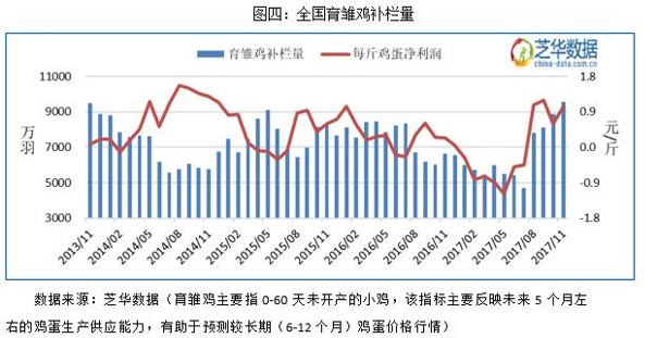 蛋鸡养殖盈利与补栏量密切相关,2017年蛋价崩盘下跌,养殖户大幅亏损,1-7月补栏意愿明显减弱;8-11月份蛋价维持高位运行,刺激养殖户补栏意愿。截止2017年11月,育雏鸡补栏量较10月增加7.68%,同比增加43.63%。同时,2018年每只蛋鸡养殖处于盈利期,目前每斤鸡蛋净利润维持高位,预计2018年补栏意愿恐将维持相对高位。(详情请参考图四)