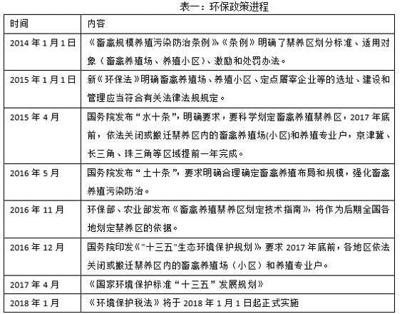 2016年12月,国务院印发《"十三五"生态环境保护规划》,要求2017年底前,各地区依法关闭或搬迁禁养区内的畜禽养殖场(小区)和养殖专业户,2017年禁养区及限养去蛋鸡养殖也受到了影响(详情请参考表一)。中央环保督察从2016年1月在河北开展试点,至2017年8月,第四批中央环保督察已完成进驻四川、吉林等8省份。至此,从2016年到2017年两年的时间,中央环保督察完成了对全国所有省份的覆盖(详情请参考表二)。