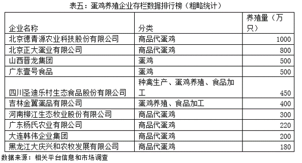 环保问题加速散户退出,但蛋鸡规模化养殖进程更不可忽视。受2017年1-7月蛋鸡养殖的巨幅亏损以及环保因素等多方面的影响,资金对蛋鸡行业关注度高,大企业正在全国布局百万级别的蛋鸡养殖场,包括山西晋龙、北京正大、广东壹号食品、德青源、柳江等等。根据行业相关平台信息和市场调查显示,粗略统计,蛋鸡养殖企业存栏数量排名前十总存栏约4550万羽,按全国蛋鸡总存栏14亿推算,占总存栏3.25%,规模化相比前期有明显提升。(详情请参考表五)