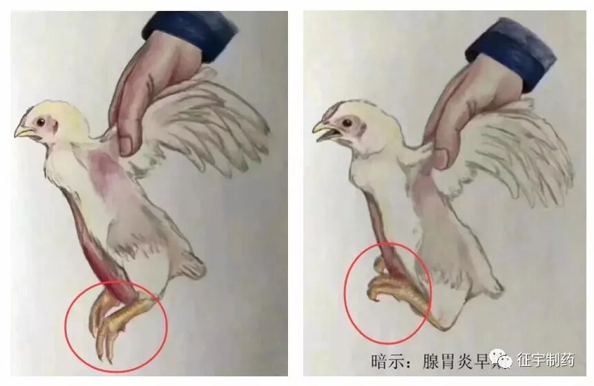 进鸡舍里把小鸡的翅膀握住提起鸡来,鸡爪下垂放松的状态是健康的鸡,如果鸡腿和爪子向上勾着的就是腺胃炎早期信号。